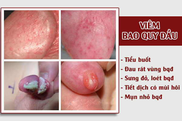 Là tình trạng viêm nhiễm tại bao quy đầu do vi khuẩn, nấm hoặc virus gây ra khi nam giới vệ sinh kém, dài/hẹp bao quy đầu, quan hệ tình dục không an toàn. Biểu hiện của bệnh như: Tiểu buốt, đau rát vùng quy đầu, sưng đỏ, tiết dịch có mùi hôi, có thể xuất hiện mụn nhỏ hoặc vết loét.